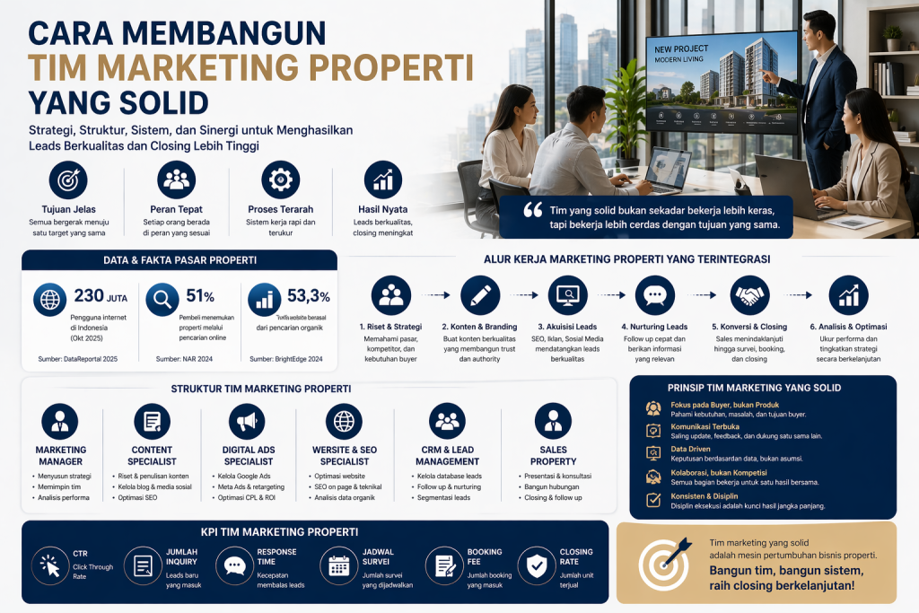 Di tengah pasar yang semakin digital, tim marketing properti yang kuat bukan hanya tim yang kreatif, tetapi tim yang sistematis. Ketika internet Indonesia sudah menjangkau sekitar 230 juta pengguna, pencarian online memainkan peran besar dalam penemuan properti, dan organic search tetap dominan sebagai sumber traffic, maka kekompakan tim marketing akan sangat menentukan apakah brand Anda hanya terlihat aktif atau benar-benar menghasilkan penjualan.