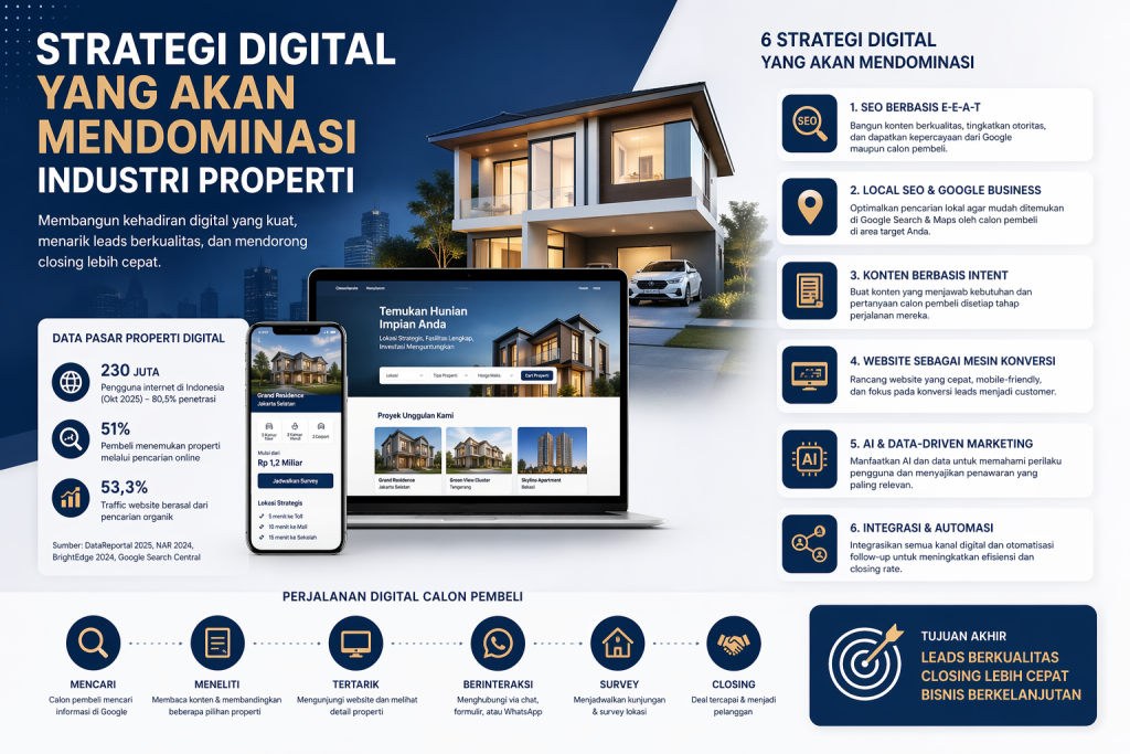 Bagi bisnis properti, pesan utamanya sederhana: jangan lagi mengandalkan satu kanal atau satu format promosi. Bangun aset digital yang bisa ditemukan, dipercaya, dan dihubungi dengan mudah. Selama Indonesia tetap sangat digital, pencarian online tetap kuat, dan pengguna terus membandingkan pilihan sebelum membeli, strategi seperti inilah yang akan mendominasi industri properti.