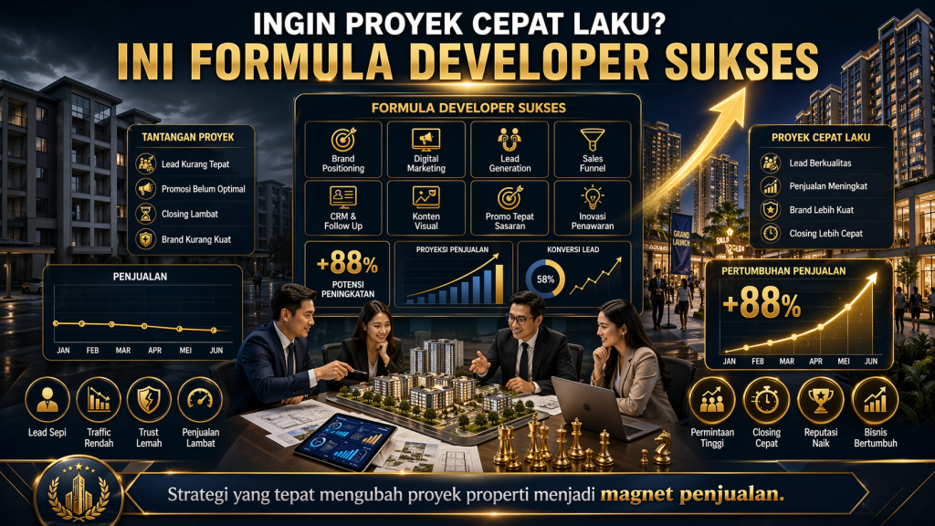 Jika ingin proyek cepat laku, developer harus berhenti berpikir bahwa penjualan hanya ditentukan oleh lokasi dan promosi. Formula developer sukses jauh lebih lengkap: produk yang sesuai kebutuhan pasar, positioning yang tajam, harga yang masuk akal, skema KPR yang memudahkan, presentasi visual yang kuat, digital marketing yang benar-benar bekerja, staging yang menjual gaya hidup, tim sales yang responsif, dan reputasi yang kredibel. Data BI menunjukkan pasar residensial Indonesia masih bergerak dengan penjualan primer tumbuh 7,83% pada triwulan IV 2025, sementara data Rumah123 dan DataReportal menegaskan bahwa pembeli aktif kini didominasi generasi muda yang sangat digital.