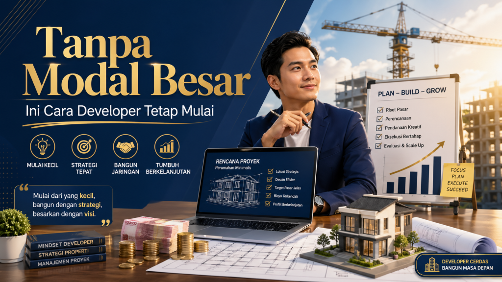 Banyak orang ingin masuk ke bisnis developer, tetapi langsung berhenti di satu titik: modal. Harga tanah tinggi, biaya konstruksi naik, perizinan terasa rumit, dan pemasaran butuh anggaran. Akibatnya, banyak calon developer menganggap bisnis ini hanya bisa dimulai oleh pemain besar. Padahal, realitasnya tidak sesederhana itu. Tanpa modal besar, developer tetap bisa mulai selama memahami bahwa inti bisnis properti bukan hanya soal punya uang banyak, melainkan soal mengelola peluang, membangun skema kerja sama, dan membaca kebutuhan pasar dengan lebih cerdas.