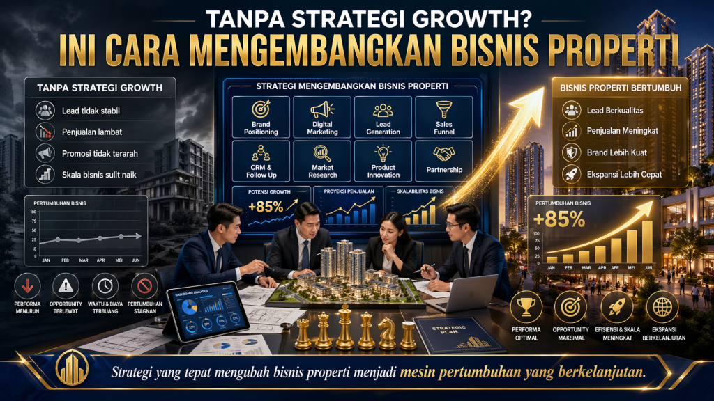Strategi growth adalah pendekatan terstruktur untuk meningkatkan penjualan, memperkuat positioning, memperbesar aliran leads, dan membuat bisnis properti lebih efisien serta scalable.