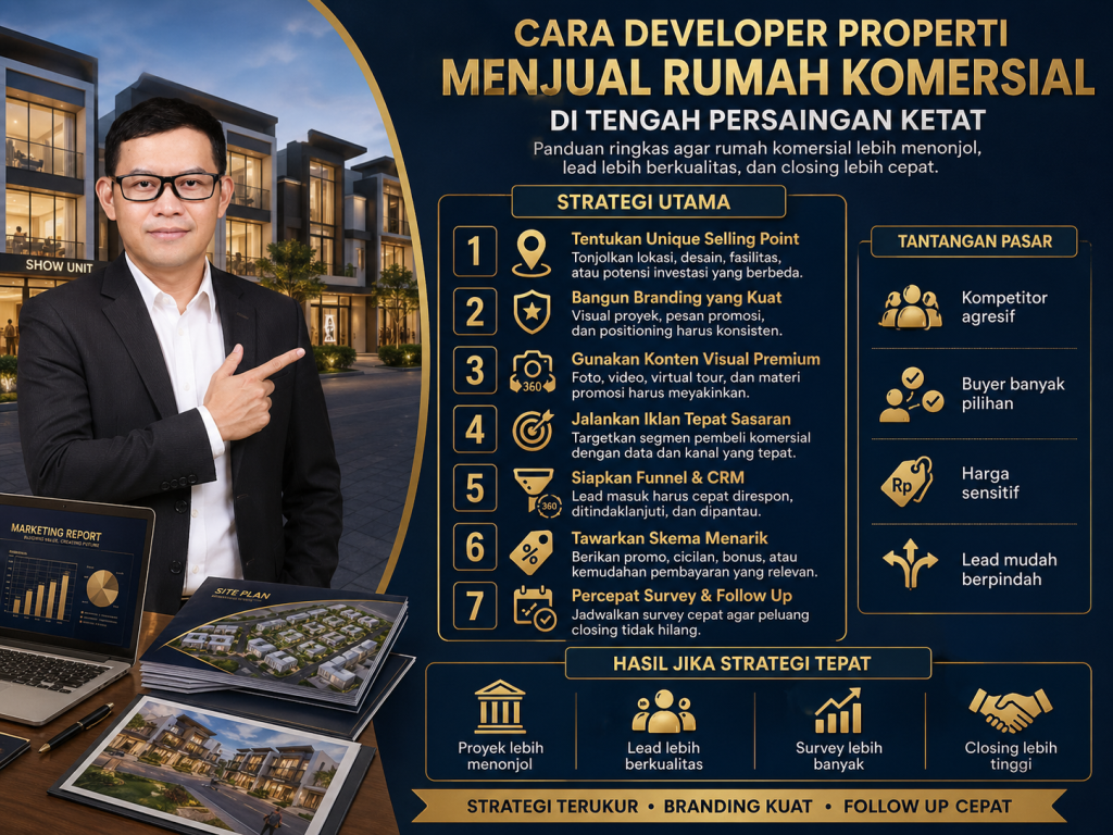 Karena itu, cara developer properti menjual rumah komersial di tengah persaingan ketat harus berubah. Kuncinya bukan sekadar “lebih banyak iklan”, tetapi strategi yang lebih tajam, lebih terukur, dan lebih dekat dengan perilaku pasar.