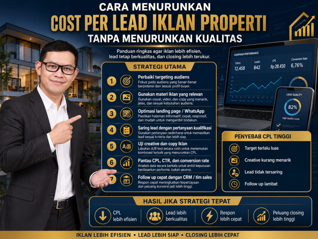 Cara menurunkan cost per lead iklan properti tanpa menurunkan kualitas bukan dengan mengejar leads murah sebanyak-banyaknya. Strategi yang benar adalah memperbaiki funnel dari awal sampai akhir: buyer persona, targeting, copywriting, landing page, form kualifikasi, retargeting, SEO, CRM, respons sales, dan evaluasi cost per booking.