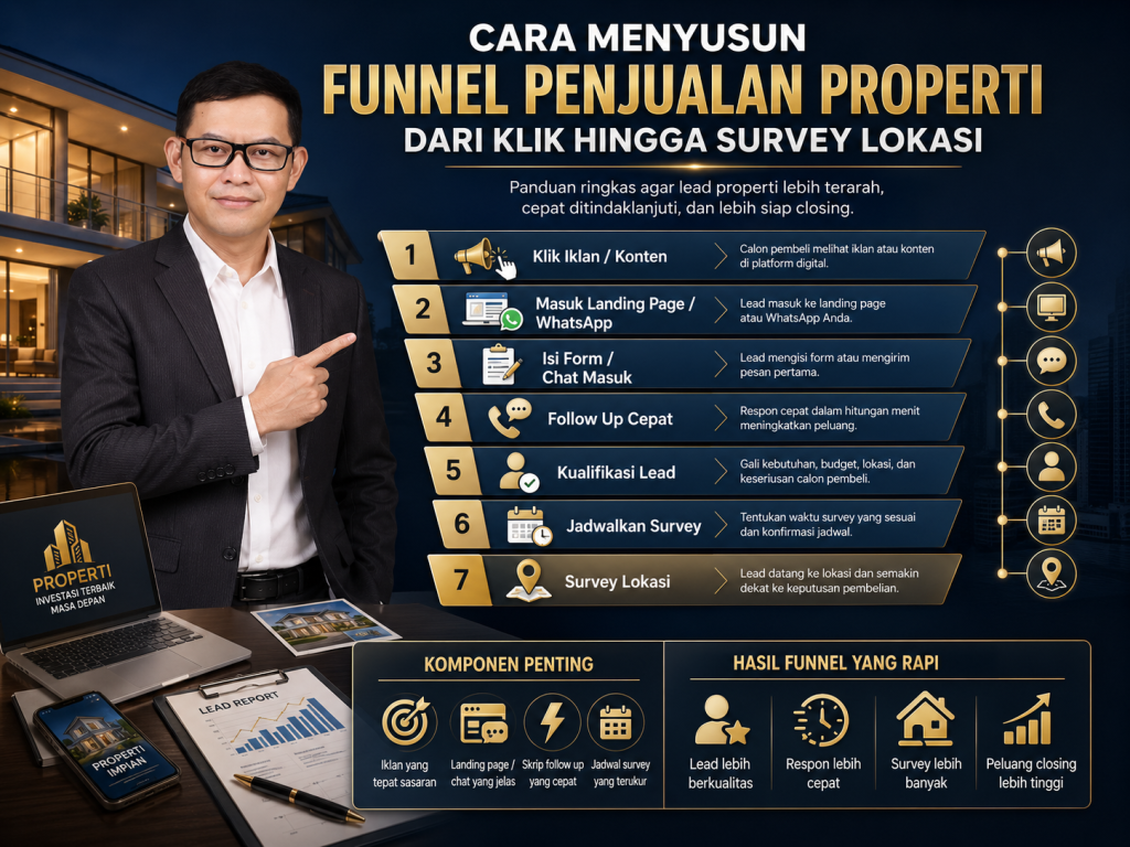 Cara menyusun funnel penjualan properti dari klik hingga survey lokasi harus dilakukan secara sistematis. Mulailah dari target konsumen yang jelas, pesan iklan yang menyaring, landing page informatif, CTA yang spesifik, WhatsApp qualification, respons sales cepat, edukasi leads, penjadwalan survey, CRM, retargeting, konten pendukung, dan evaluasi data.