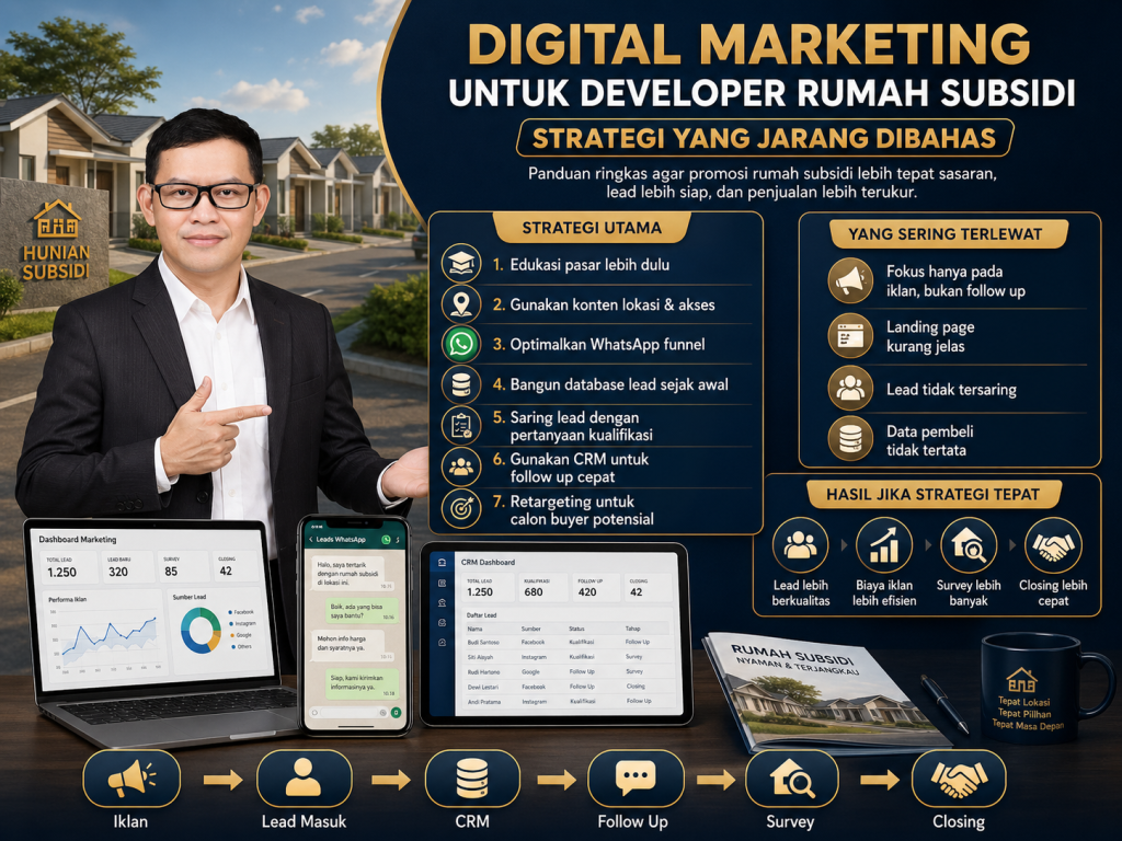 Digital marketing untuk developer rumah subsidi harus lebih dari sekadar iklan harga murah. Strategi yang jarang dibahas tetapi efektif adalah edukasi syarat FLPP, lead magnet checklist dokumen, landing page khusus, segmentasi berdasarkan pekerjaan, SEO lokal, konten simulasi cicilan, WhatsApp funnel, retargeting, testimoni akad, kolaborasi komunitas, edukasi SLIK, dan pengukuran cost per akad.
