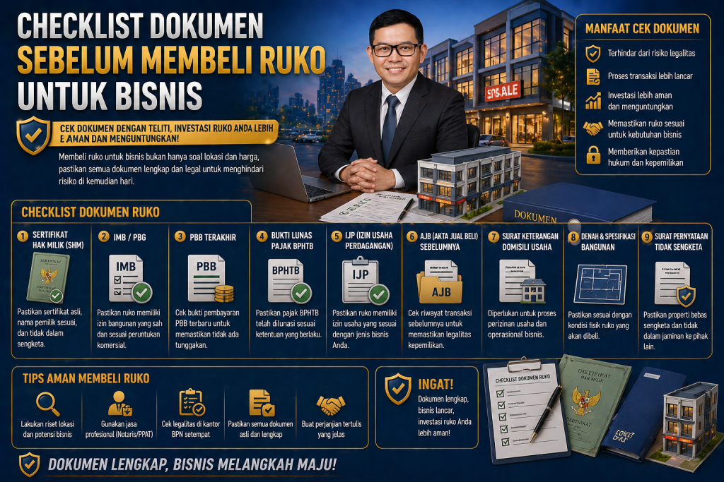 Checklist dokumen sebelum membeli ruko untuk bisnis harus diperlakukan sebagai bagian dari strategi investasi, bukan formalitas belaka. Sertipikat, hasil pengecekan status, PBG, SLF, PBB, AJB, identitas para pihak, dan kesiapan dokumen usaha wajib diperiksa satu per satu. Dengan langkah ini, Anda bukan hanya membeli bangunan, tetapi juga membeli kepastian hukum, keamanan transaksi, dan ketenangan untuk menjalankan bisnis. Selalu libatkan PPAT, cek layanan resmi ATR/BPN, dan pastikan seluruh proses berlanjut sampai balik nama tuntas.