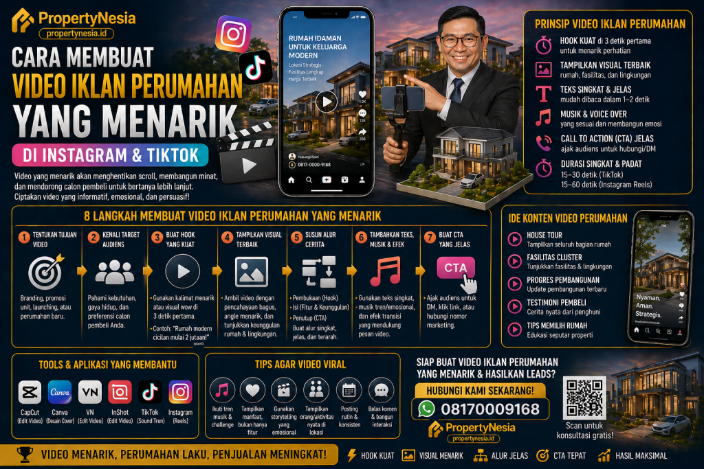 Cara membuat video iklan perumahan yang menarik di Instagram dan TikTok dimulai dari pemahaman bahwa calon buyer membutuhkan visual, kepercayaan, dan informasi yang jelas. Video tidak boleh hanya indah, tetapi harus punya tujuan, hook kuat, alur sederhana, visual nyata, pesan spesifik, CTA jelas, dan sistem follow up yang siap.
