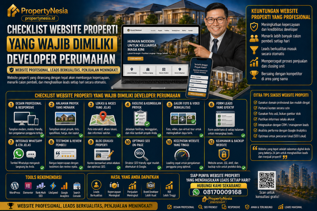 Checklist website properti yang wajib dimiliki developer perumahan tidak hanya berkaitan dengan desain yang menarik. Website harus informatif, cepat, mobile friendly, SEO friendly, mudah dihubungi, dan terhubung dengan sistem penjualan. Developer perlu memastikan setiap halaman membantu calon buyer memahami proyek dan mengambil langkah berikutnya.