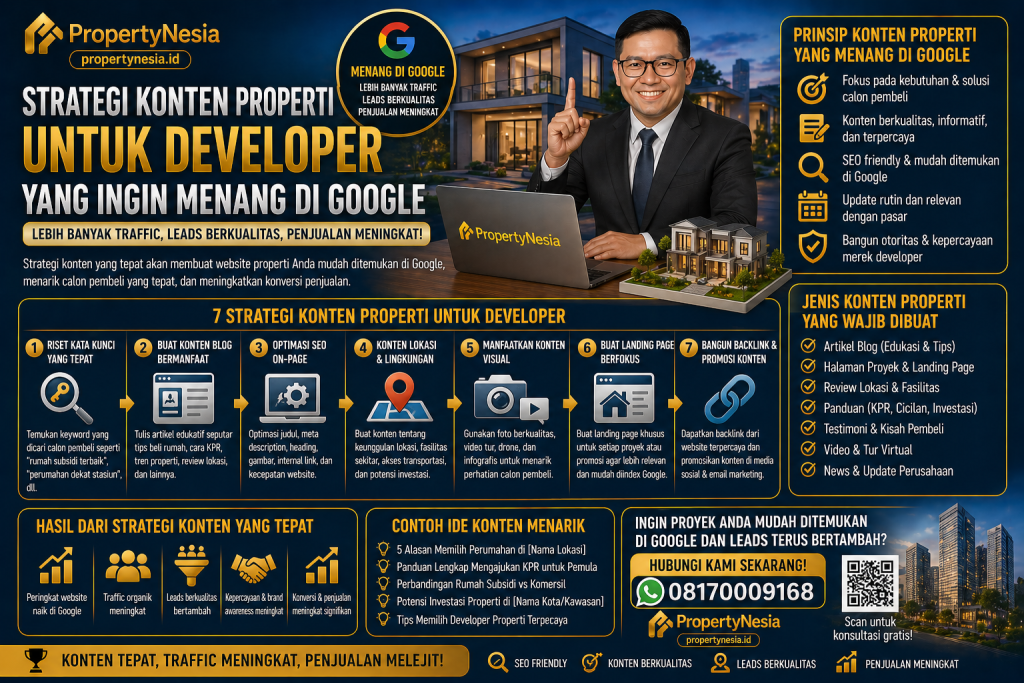 Strategi konten properti untuk developer tidak bisa lagi dibuat asal posting artikel atau sekadar mengisi website dengan brosur digital. Saat ini, calon pembeli rumah, ruko, apartemen, kavling, maupun properti komersial semakin aktif mencari informasi di Google sebelum menghubungi sales. Mereka tidak hanya mencari harga, tetapi juga lokasi, legalitas, fasilitas, akses, simulasi KPR, reputasi developer, ulasan pembeli, hingga perbandingan kawasan.