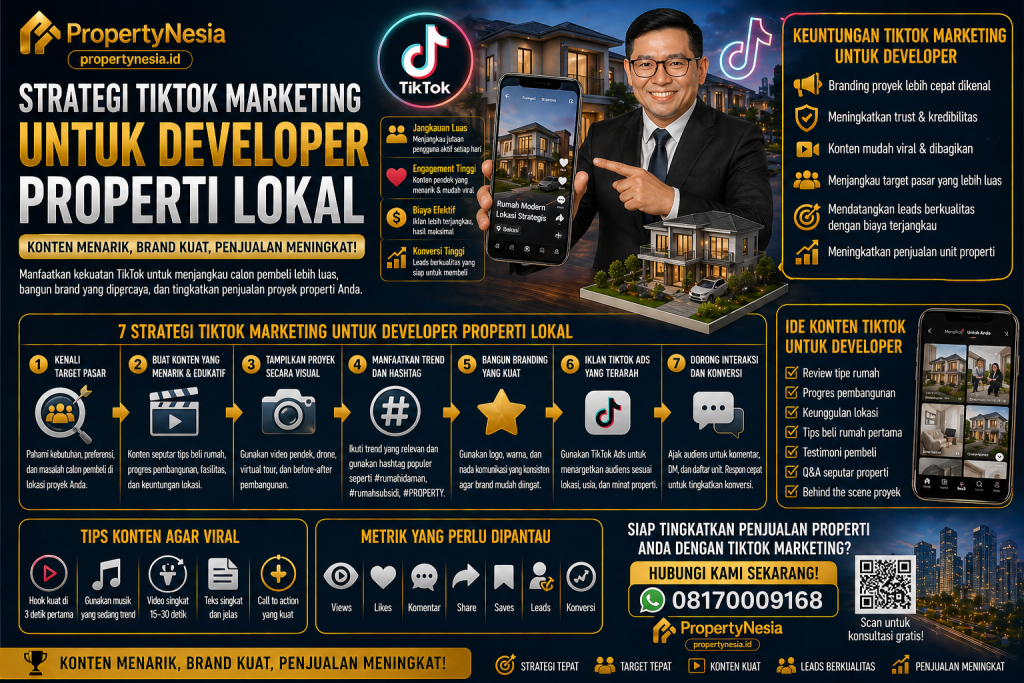 Strategi TikTok Marketing untuk developer properti lokal harus dibangun sebagai bagian dari funnel penjualan, bukan sekadar aktivitas posting video. TikTok dapat membantu developer memperkenalkan proyek, membangun kepercayaan, menunjukkan lokasi, menjelaskan KPR, menampilkan progres, dan menarik calon buyer untuk datang ke show unit.
