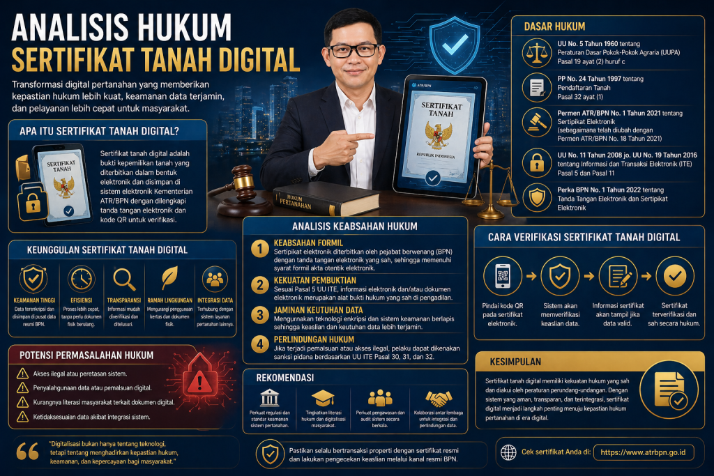 Secara hukum, sertifikat tanah digital merupakan perkembangan penting dalam sistem pertanahan Indonesia. Dasar hukumnya telah tersedia melalui Permen ATR/Kepala BPN Nomor 3 Tahun 2023, dan penerapannya terus berkembang secara bertahap.